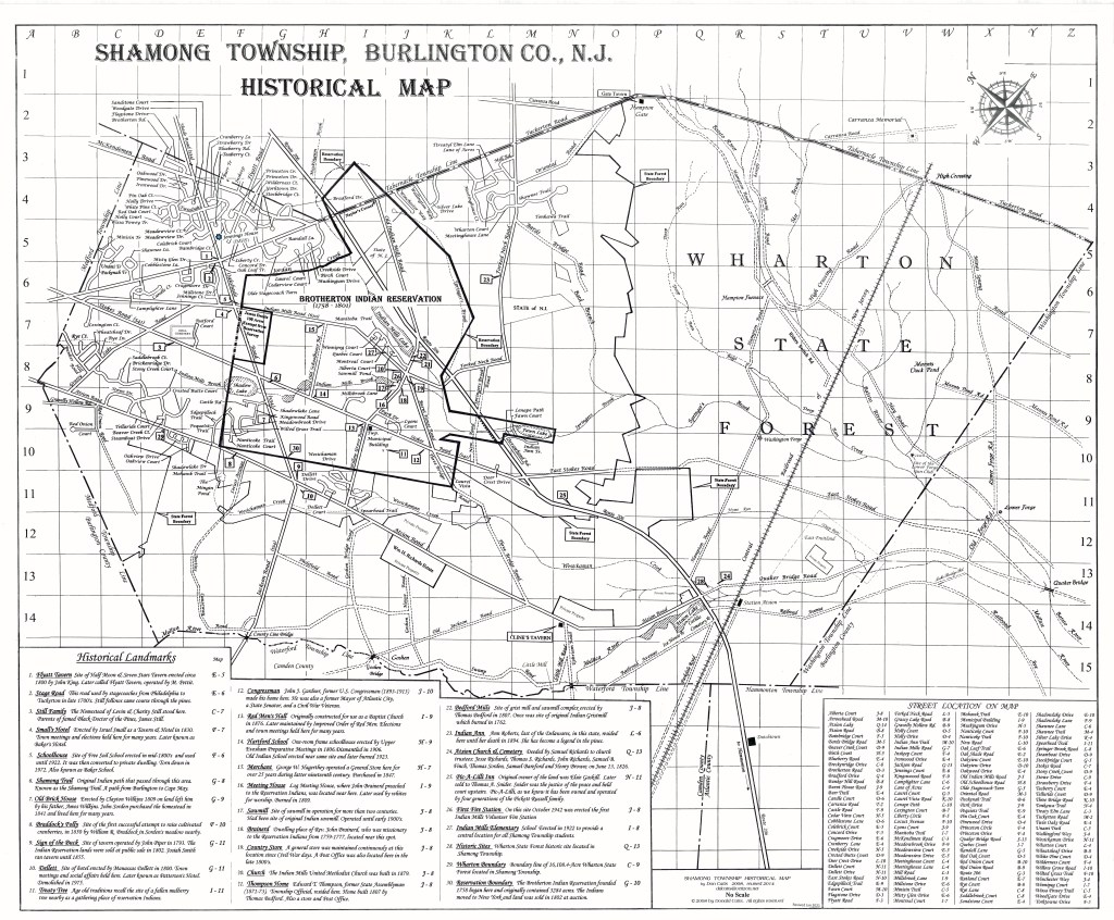1. Flyatt 2. Stage Road 3. Still Family 4. Small’s Hotel 5. Schoolhouse 6. Shamong Trail 7. Old Brick House 8. Braddock’s Folly 9. Sign of the Buck 10. Dellett 11. Treaty Tree 12. Congressman 13. Red Men’s Hall 14. Hartford School 15. Merchant 16. Meeting House 17. Sawmill 18. Brainerd 19. Country Store 20. Church 21. Thompson Home 22. Bedford Mills 23. Indian 24. Atsion Church & Cemetery 25. Pic-A-Lilli Inn 26. First Fire Station 27. Indian Mills Elementary 28. Historic Sites 29. Wharton 30. Reservation Boundary, 31. Jennings House 32. Still Burial Ground 33. Indian Burial Ground 34. Gate Tavern 35. Hampton (Forge) 36. Cline’s Tavern 37. Little Mill 38. Catholic Burial Ground 39. Ice House. 40. William. 41. Washington Forge 42. East Fruitland 43. Willow Grove Farm 44. Charter School 45. Naylor’s Corner