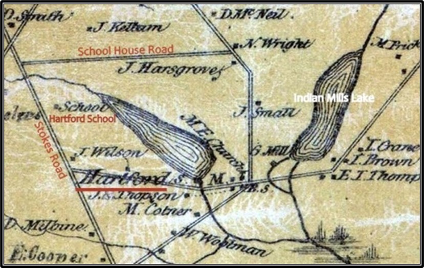 Before Shamong was incorporated as a Township, the area was known as Hartford. In 1805, the Upper Evesham (Medford) Preparative Meeting (Society of Friends) bought a 3 acre lot (actually 4.85 acres) at the corner of Wright’s Lane (School House Road today) and Stokes Road, on the old Brotherton Reservation. They constructed a one room school/meetinghouse facing Wright’s Lane, and called it Hartford. In the far corner of the Hartford property they laid out a cemetery.
