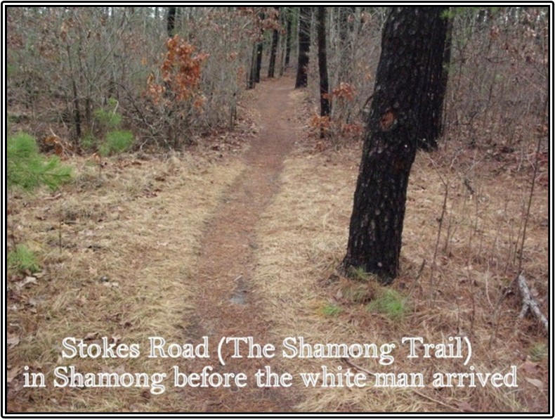 The trail was traveled by early European settlers who cleared and widened it into a crude road to accommodate their wagons and Ox carts. Over the years the road was improved several times. Eventually, with the coming of the automobile the road was widened and graded. Today the northern section of the Shamong trail is known as Route 541 for some 25 miles from Burlington City to Route 206 in Shamong Township.