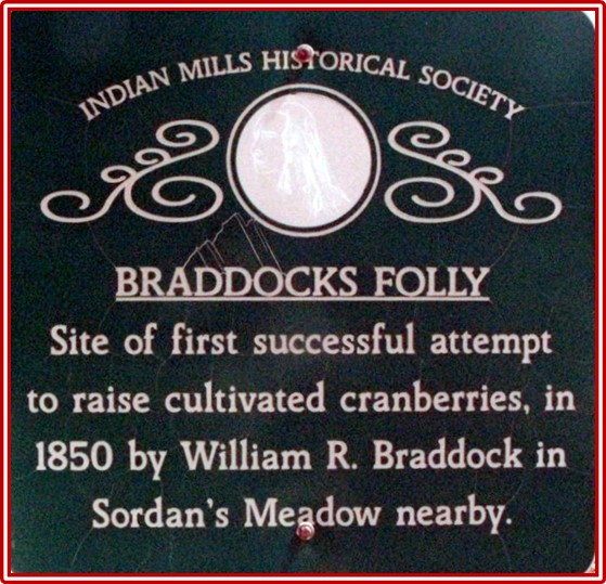 “Braddocks Folly” William Roger Braddock, a judge from Medford, purchased large tracts of land on both the north and south side of Atsion Road. One tract on the north side included a large meadow, known as “Sorden’s Meadow”. Cultivating cranberries was unheard of at the time. In 1850, when Braddock attempted to cultivate cranberries in Sorden’s Meadow, the meadow became known as “Braddock Folly.” However, he was very successful and is credited as being the first in the area to produce cultivated cranberries.