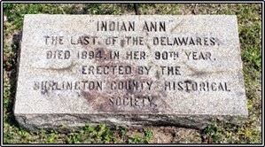 Ann was known to the residents of Indian Mills as an eccentric character. She was a frequent visitor on surrounding farms and in the neighboring towns of Medford, Vincentown, and Lumberton, where she sold hand-woven baskets, brooms, and berries. Ann Roberts frequently walked to the railroad station in Medford where she would take the train to Mt. Holly to sell her baskets and other trinkets she had made. At times she was so exhausted she was unable to make the long walk home and slept overnight at the train station. In the morning she would continue her journey home. Indian Ann died at home December 10, 1894. Her remains were taken to the Tabernacle Methodist-Episcopal Church on Chatsworth Road in Tabernacle for Memorial Services. On December 13, 1894 Ann was buried in the Tabernacle cemetery in an unmarked grave. Many years after her death, the Burlington County Historical Society installed a marker indicating that she was considered to have been the last Lenape living in the county.