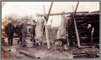 This is a typical annual hog killing in early Shamong. This one is on the farm of Henry Wright.